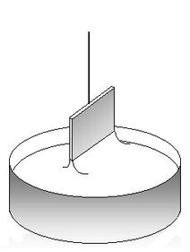 Two different approaches can be used, the plate can be left suspended, bridging the two phases, or the plate can be pulled through the interface. The experiments can run for hours. In practice, a wire attached to a balance usually suspends the plate. The solution of interest is raised so that its surface just touches the bottom of the plate. The principle of the plate method is so simple that it can be set up easily in any laboratory equipped with a balance (schematic in Fig. V.3).